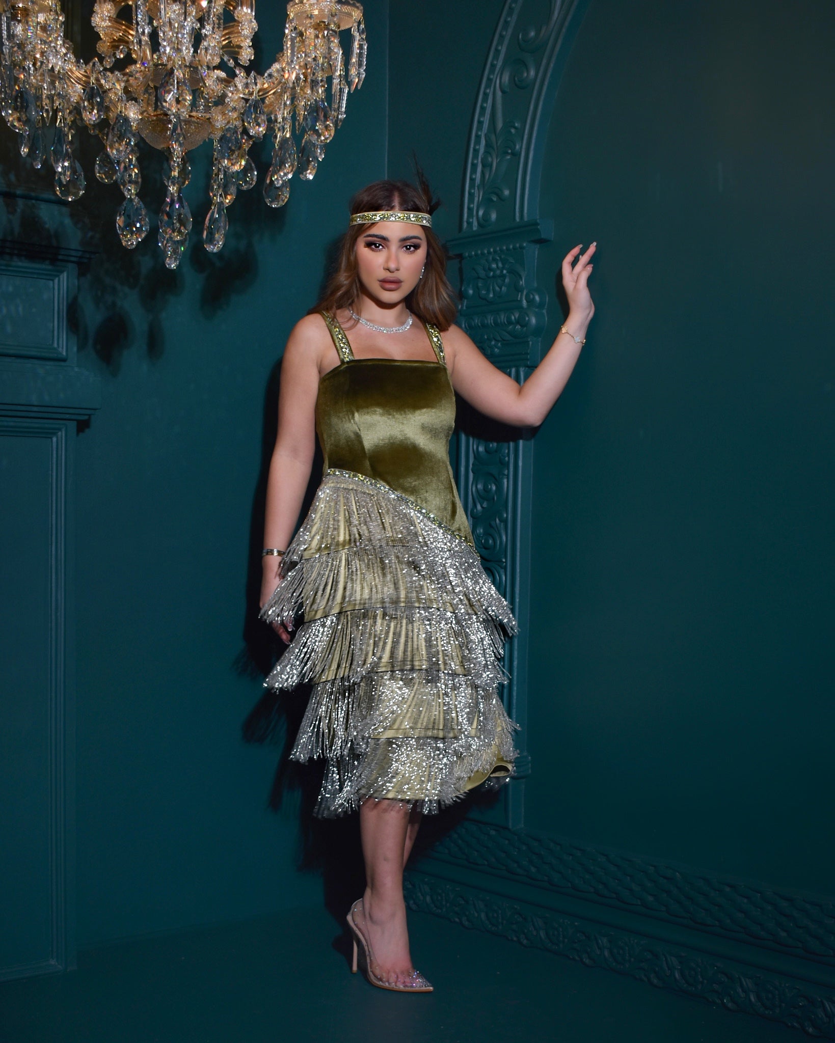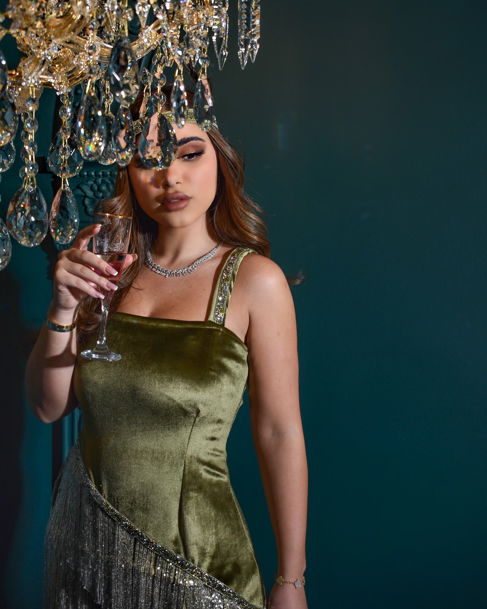 نفنوف مخمل مع هدب خرز كرستال وتطريز بدون أكمام
