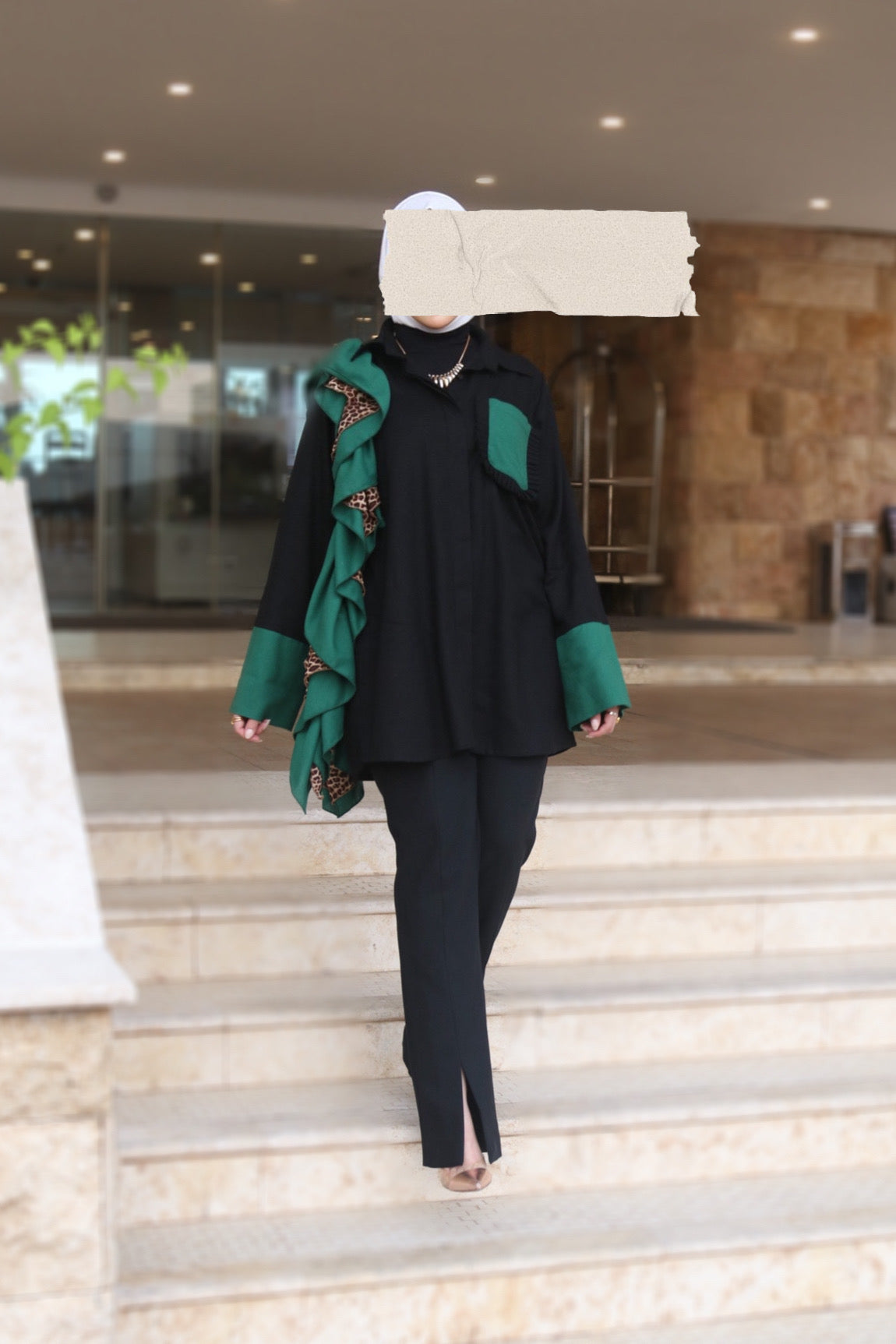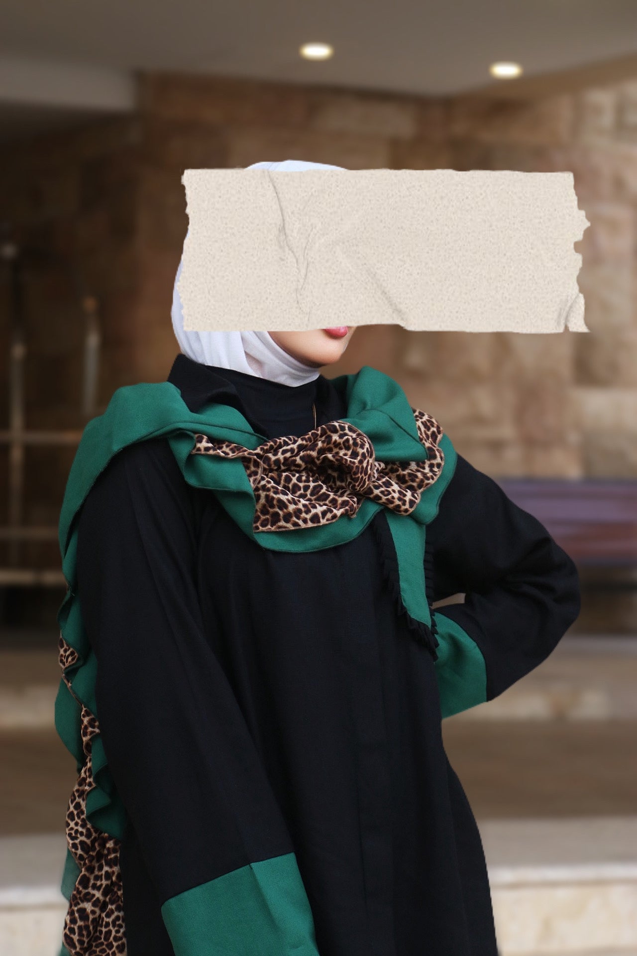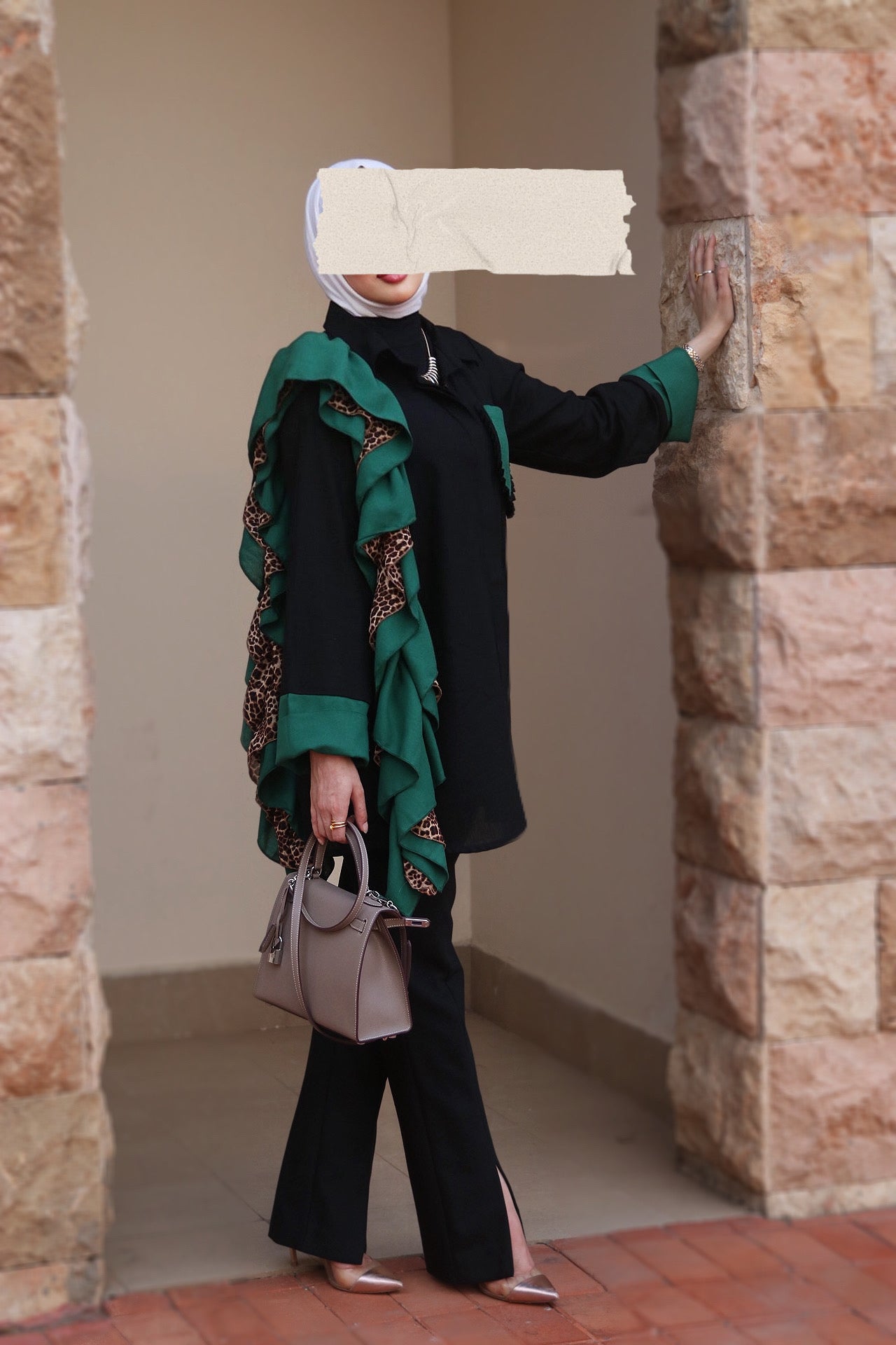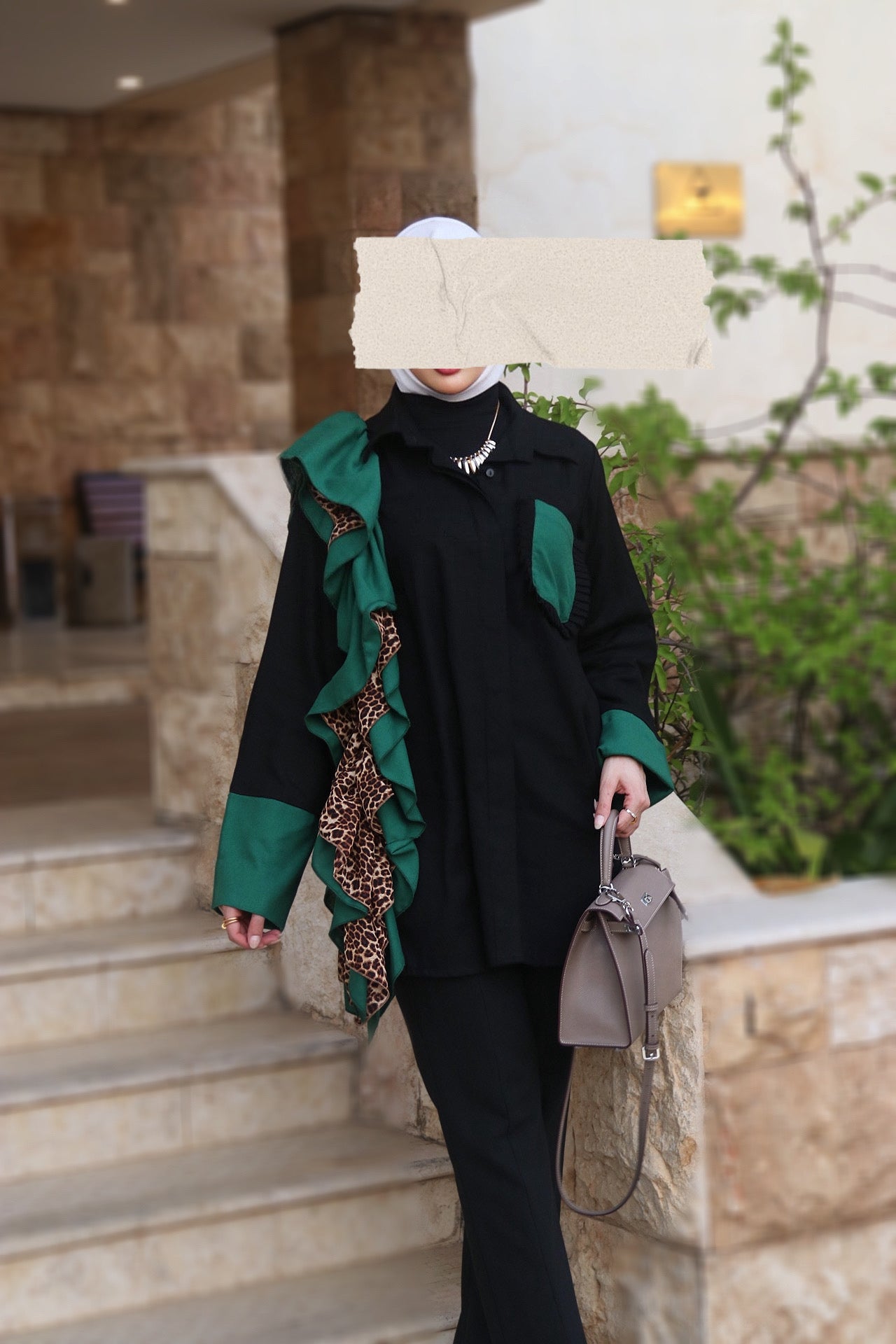 توب خام لنن أسود واخضر رفلز على جنب مثل الشال مع خام بطبعة النمر القياس حسب الاختيار من الجدول تختارين قياسج ضبط