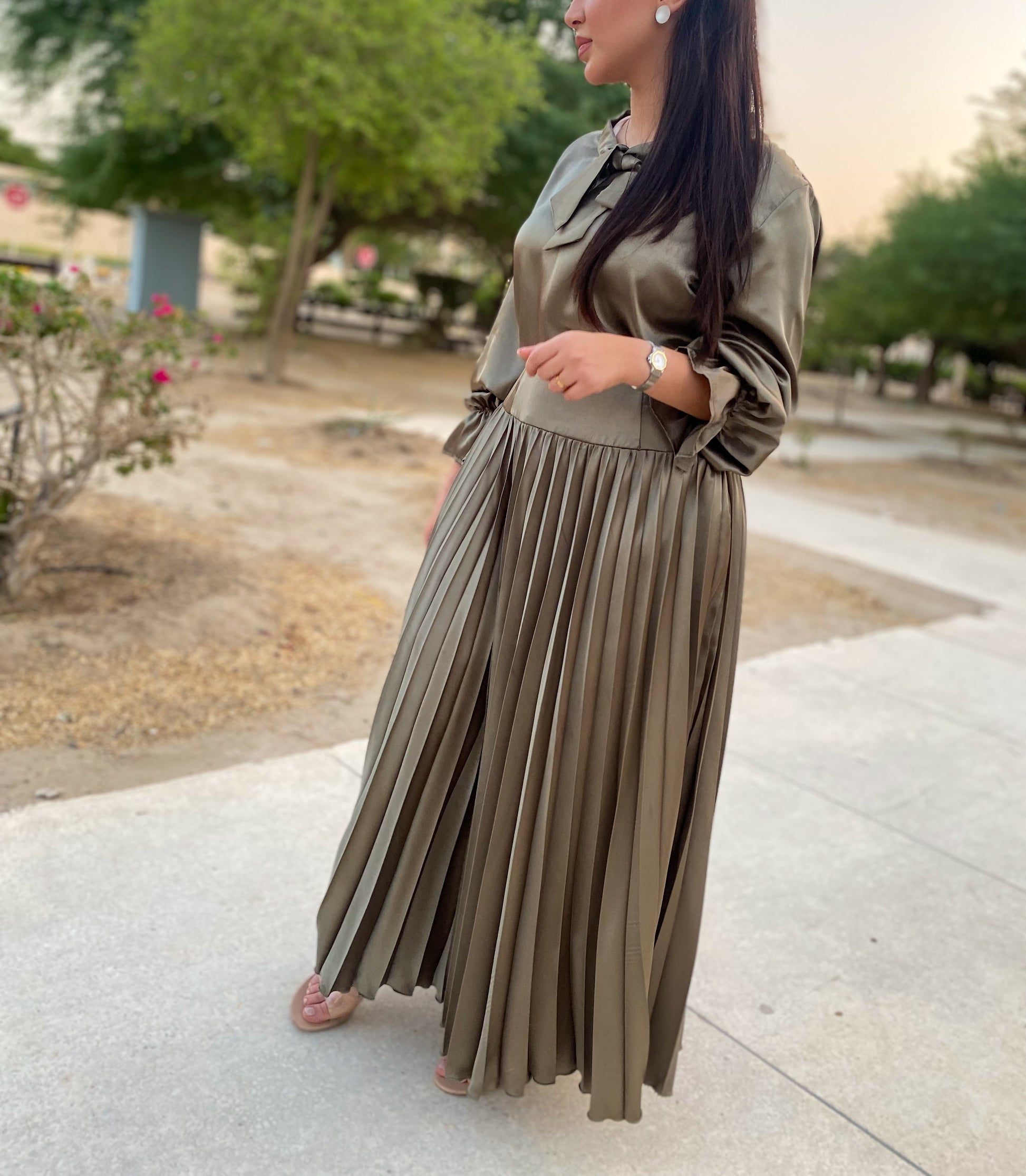 A set of Pleated skirt and top featuring draped bow collar ruffle sleeves